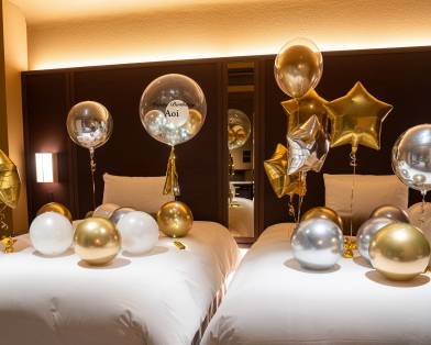 「ふふ 奈良」ではバルーンサービスを承っております。 大切な方のお誕生日やお二人の特別な記念日など、特別な日にお部屋を彩るバルーンのご用意はいかがでしょうか。 ご予約はこちらより承っております。
